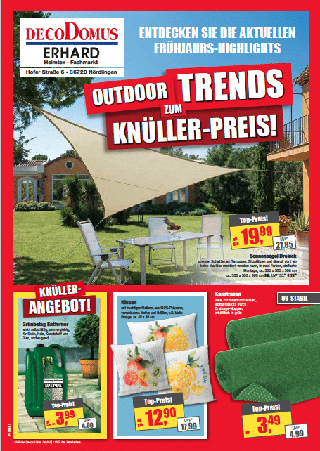 Tradition und Know-How seit 1928 DecoDomus teilt sich in folgende Firmen auf: Erhard GmbH & Co. KGHeimtex-Fachmarkt Einzelhandel Erhard GmbH & Co. KGHofer Str. 686720 Nördlingen 09081 / 2596–90 09081 / 2596–95 info@fachmarkt-erhard.de Öffnungszeiten Montag – Freitag:09:00 – 18:30 UhrSamstag:09:00 – 14:00 Uhr Raumausstattung Erhard GmbHObjektausstattung / Bodenbeläge Großobjekte Raumausstattung Erhard GmbHHofer Str. 686720 Nördlingen 09081 / 2596–0 09081 / 2596–50 info@decodomus-erhard.de Öffnungszeiten Montag – Freitag:08:00 – 16:30 Uhr